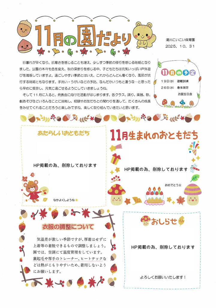 2025年10月31日 2025年11月の園だより category -園だより(湯川園) « 2025年10月の園だより カレンダー 2025年10月 月 火 水 木 金 土 日 12345 6789101112 13141516171819 20212223242526 2728293031 « 9月 カテゴリー 保育園からのお知らせ 園だより(湯川園) 園だより(霧ヶ丘園) 記事を一覧で見る 最近の記事 2025年11月の園だより 10月31日(金) 湯川こいこい保育園 ハロウィン集会 2025年11月の園だより 10月31日(金) 霧ヶ丘こいこい保育園 ハロウィン集会 (タイトルなし) 過去の記事 2025年10月 2025年9月 2025年7月 2025年6月 2025年5月 2025年4月 2025年3月 2025年2月 2025年1月 2024年12月 2024年11月 2024年10月 2024年9月 2024年7月 2024年5月 2024年4月 2024年2月 2023年11月 2023年6月 2023年5月 2023年4月 2023年3月 2023年2月 2023年1月 2022年12月 2022年11月 2022年10月 2022年9月 2022年8月 2022年7月 2022年6月