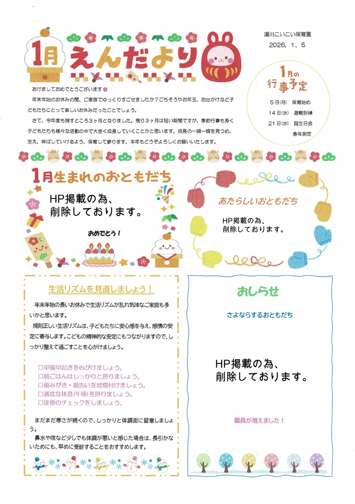 2026年1月7日 2026年1月の園だより category -園だより(湯川園) « 2025年12月の園だより カレンダー 2026年1月 月 火 水 木 金 土 日 1234 567891011 12131415161718 19202122232425 262728293031 « 12月 カテゴリー 保育園からのお知らせ 園だより(湯川園) 園だより(霧ヶ丘園) 記事を一覧で見る 最近の記事 2026年1月の園だより 12月25日(木) 湯川こいこい保育園 クリスマス会 (タイトルなし) 12月20日(土) 湯川こいこい保育園 第8回生活発表会♪ 2025年12月の園だより 過去の記事 2026年1月 2025年12月 2025年10月 2025年9月 2025年7月 2025年6月 2025年5月 2025年4月 2025年3月 2025年2月 2025年1月 2024年12月 2024年11月 2024年10月 2024年9月 2024年7月 2024年5月 2024年4月 2024年2月 2023年11月 2023年6月 2023年5月 2023年4月 2023年3月 2023年2月 2023年1月 2022年12月 2022年11月 2022年10月 2022年9月 2022年8月 2022年7月 2022年6月
