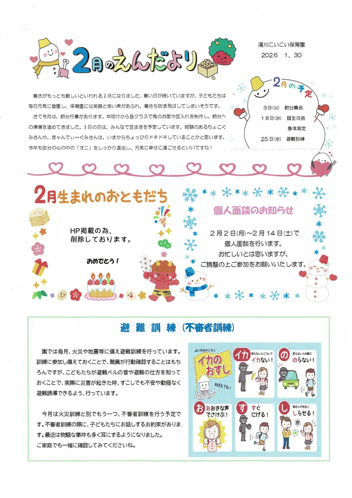 2026年1月30日 2026年2月の園だより category -園だより(湯川園) « 2026年1月の園だより カレンダー 2026年1月 月 火 水 木 金 土 日 1234 567891011 12131415161718 19202122232425 262728293031 « 12月 カテゴリー 保育園からのお知らせ 園だより(湯川園) 園だより(霧ヶ丘園) 記事を一覧で見る 最近の記事 2026年2月の園だより 2026年2月の園だより 2026年1月の園だより 2026年1月の園だより 12月25日(木) 霧ヶ丘こいこい保育園 クリスマス会 過去の記事 2026年1月 2025年12月 2025年10月 2025年9月 2025年7月 2025年6月 2025年5月 2025年4月 2025年3月 2025年2月 2025年1月 2024年12月 2024年11月 2024年10月 2024年9月 2024年7月 2024年5月 2024年4月 2024年2月 2023年11月 2023年6月 2023年5月 2023年4月 2023年3月 2023年2月 2023年1月 2022年12月 2022年11月 2022年10月 2022年9月 2022年8月 2022年7月 2022年6月